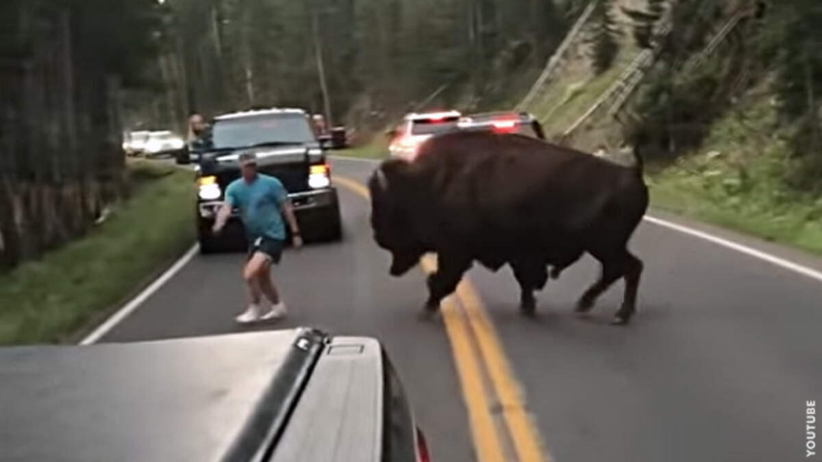 File this under 'how not to interact with wildlife.' A viral video shows a visitor apparently harassing a bison on a road at Yellowstone National Park. In the footage, a man in a blue shirt and shorts can be seen gesturing wildly at the animal, which grunts and charges, nearly goring the man in the process. Park officials called the man's actions "reckless, dangerous, and illegal."