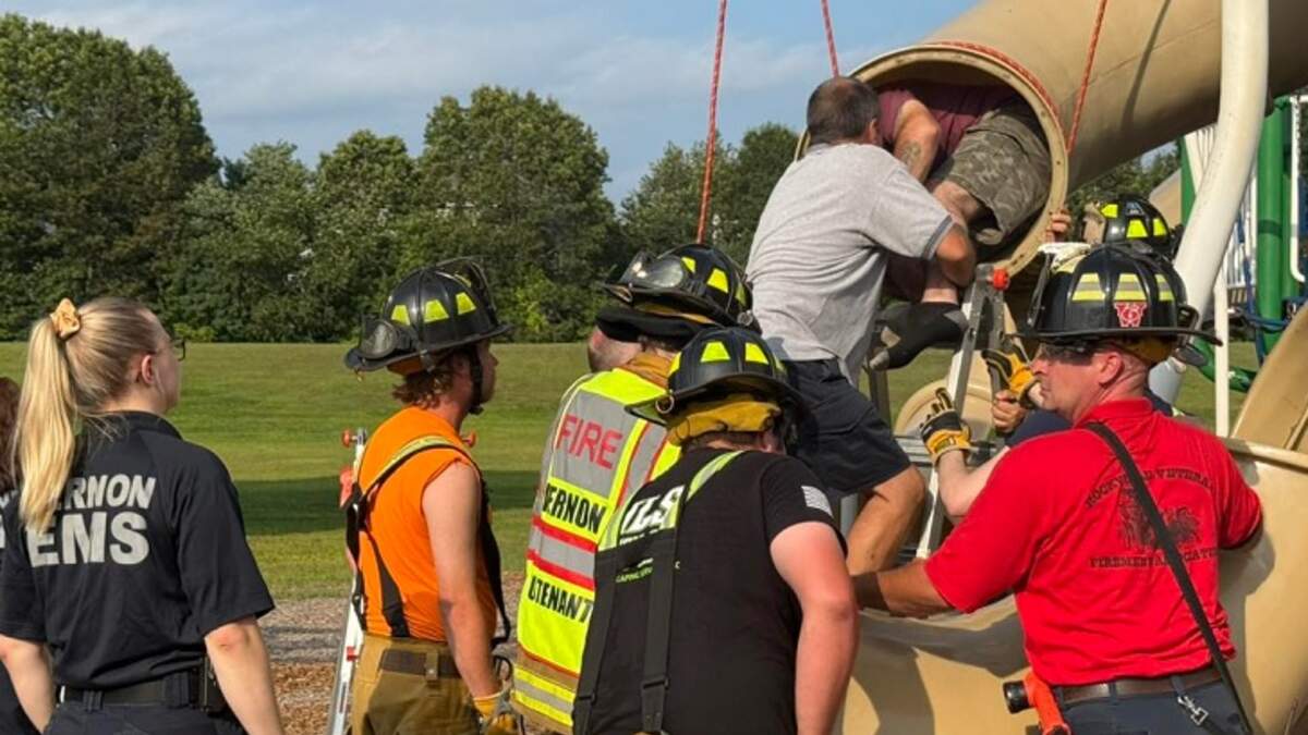 In what one imagines was a mortifying experience, a Connecticut man was forced to call 911 after he found himself stuck inside a playground tube slide. According the harrowing misadventure reportedly occurred last Saturday afternoon at an elementary school in the community of Vernon. It was there that the unnamed 40-year-old man attempted to venture down a tube slide, but the whimsical journey went wildly awry when he somehow became folded up and, police say, "wedged feet and head first" in the middle portion of the playground equipment.