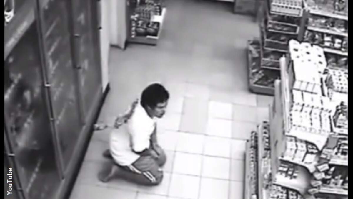 After grabbing a drink from the store's cooler, the man suddenly begins shaking and making odd guttural sounds, culminating with him falling to his knees and then passing out on the ground.