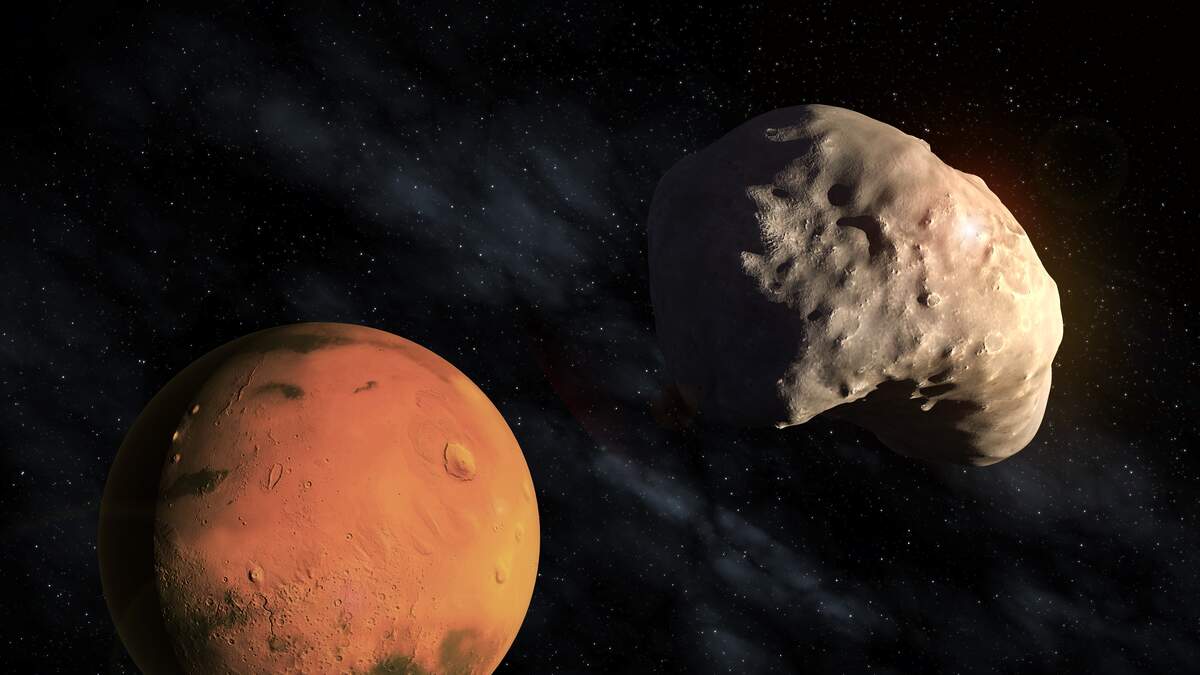 The European Space Agency's Mars Express spacecraft captured the Martian moon Deimos passing in front of its view of Jupiter and its four largest satellites. The images from Mars Express were taken by its High Resolution Stereo Camera in February 2022, and show the irregular-shaped Deimos move through the foreground as Jupiter and its Galilean moons (Europa, Ganymede, Io and Callisto) appear in the background. The motion sequence is composed of 80 individual images stitched into a single video clip. For scale, Jupiter is approximately 745 million kilometers away from Mars Express.