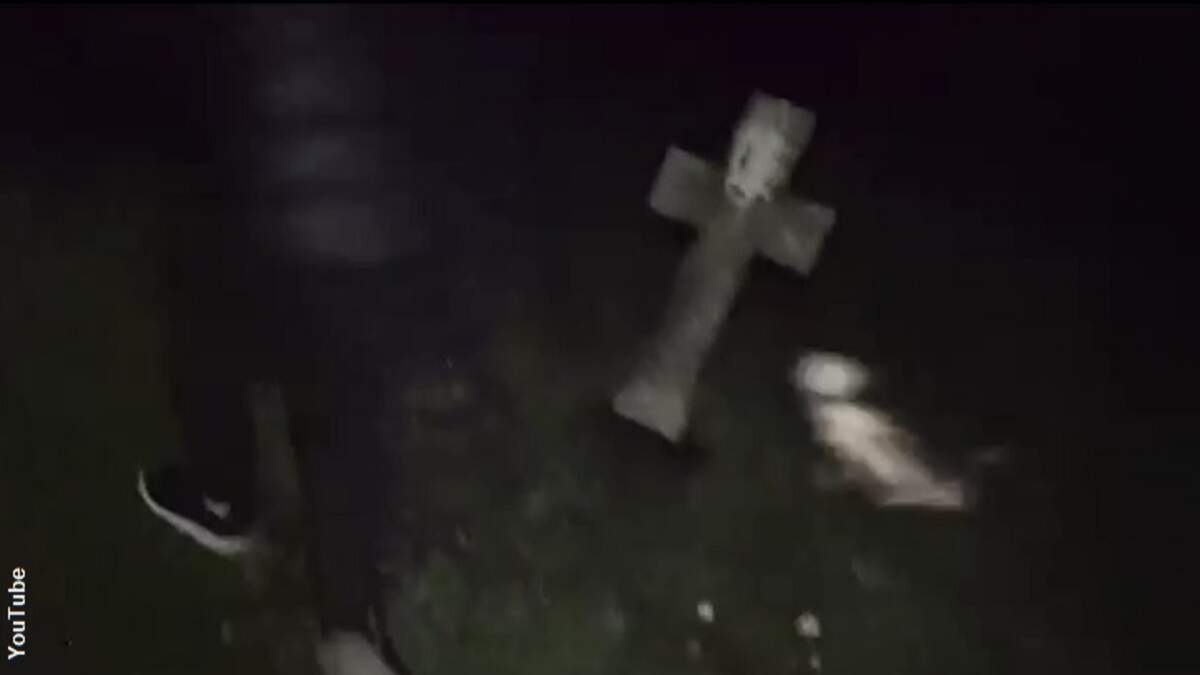Rather than treat the scene with respect, the teenager acts rather rambunctious as he roams the cemetery, laughing and throwing sticks in the air.
