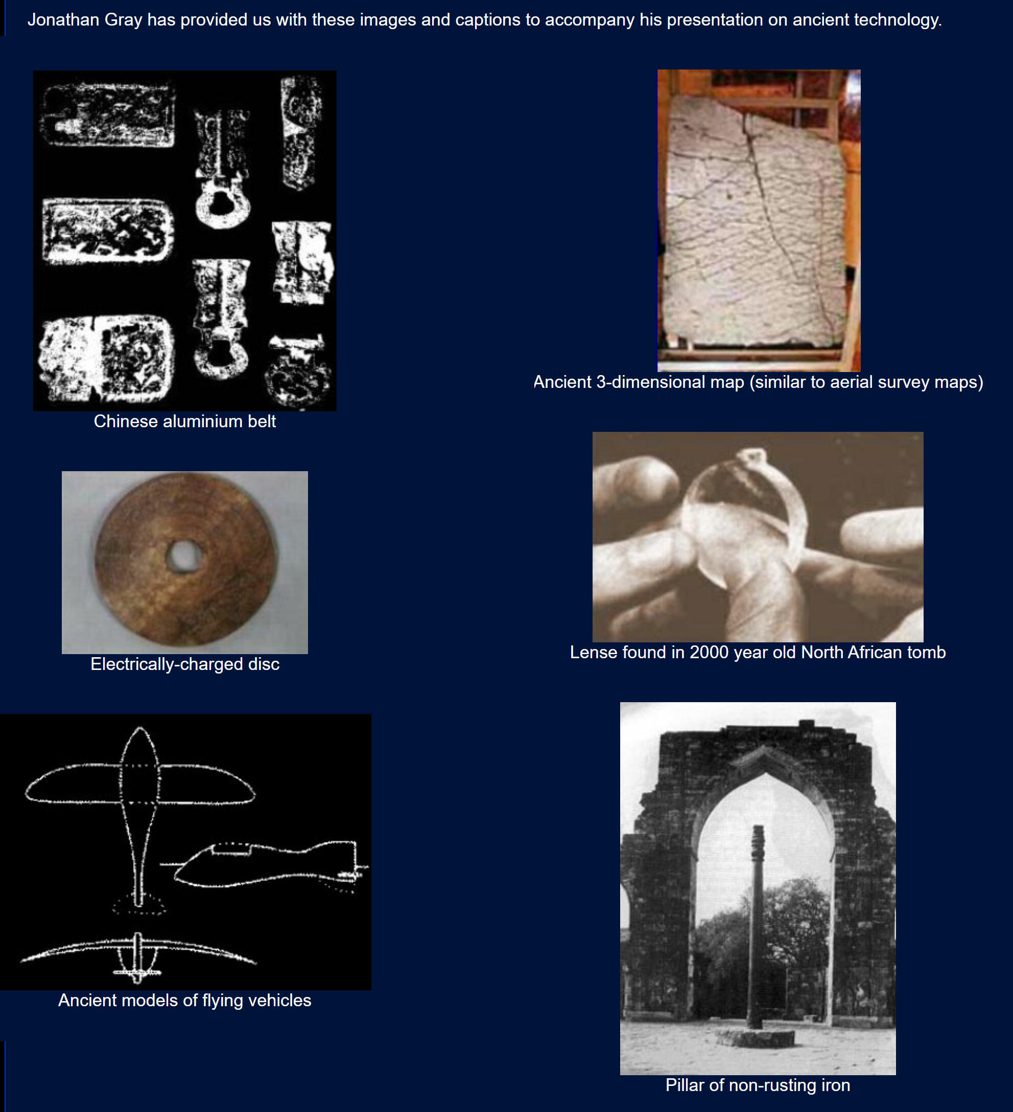 Further, he believes there is evidence, that before the cataclysm, "Mother X" civilizations had technologies which in many ways were in advance of our own. These included the use of electricity, flight, and mathematics as well as medical abilities, tunnel building skills, and knowledge of the atom. He even suggested that they may have traveled to the moon and left structures there. The survivors of the disaster, while starting out on a lower level, were able to make use of some of the passed down knowledge, he noted. For more, view 'lost technology' images that Gray sent us.