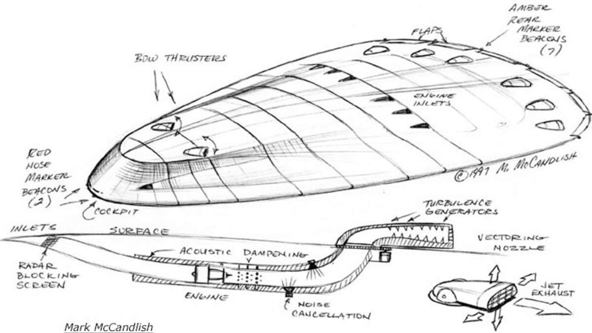 McCandlish presented his research into witness testimony regarding anomalous aircraft such as the "Alien Reproduction Vehicle" (see related images), which he suggested had been back-engineered from a "recovered" craft. Vehicles such as this may use a kind of antigravity propulsion that allows them decrease their mass as they move through space, he explained.